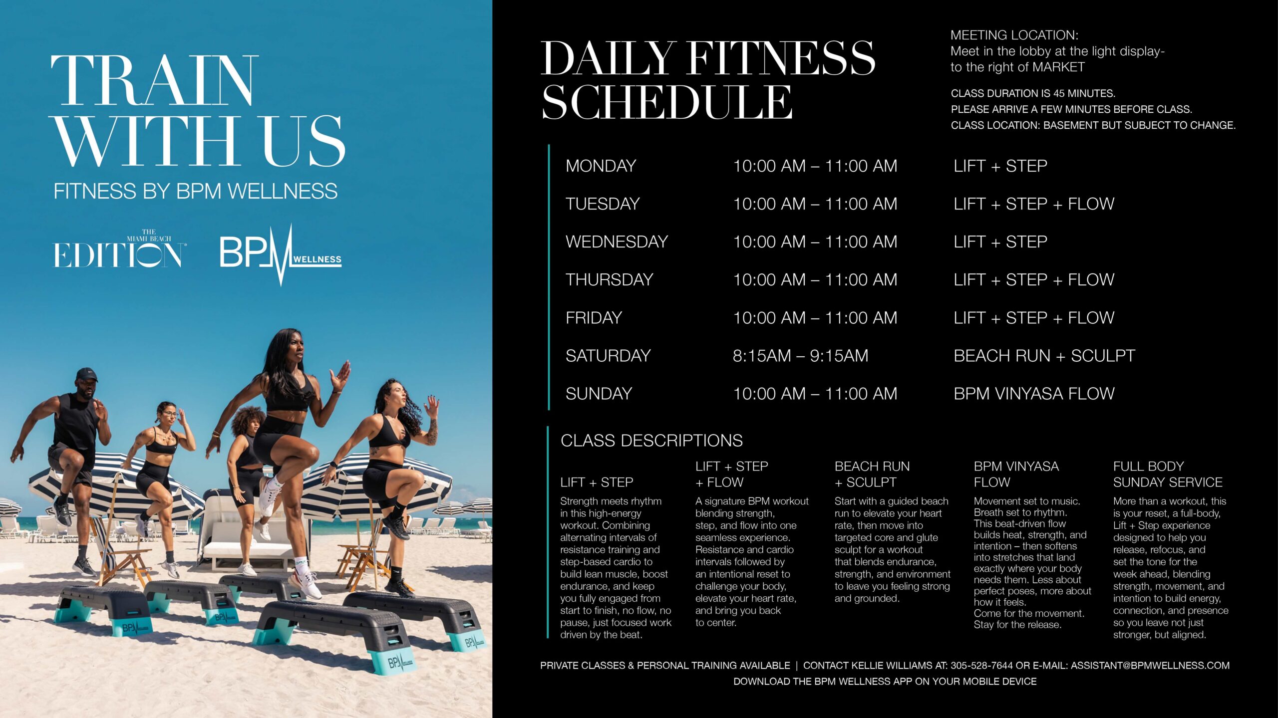 Wellness programming is led by BPM Wellness, Miami’s only Lift + Step + Flow concept—where power, mobility, and music converge. BPM blends strength training, step‑based cardio, and yoga into a seamless, rhythm‑driven experience designed to challenge the body and connect people through movement. More than a class, BPM embodies a modern wellness culture shaped by energy, sound, and community—something you feel the moment you step in. Where wellness meets culture.