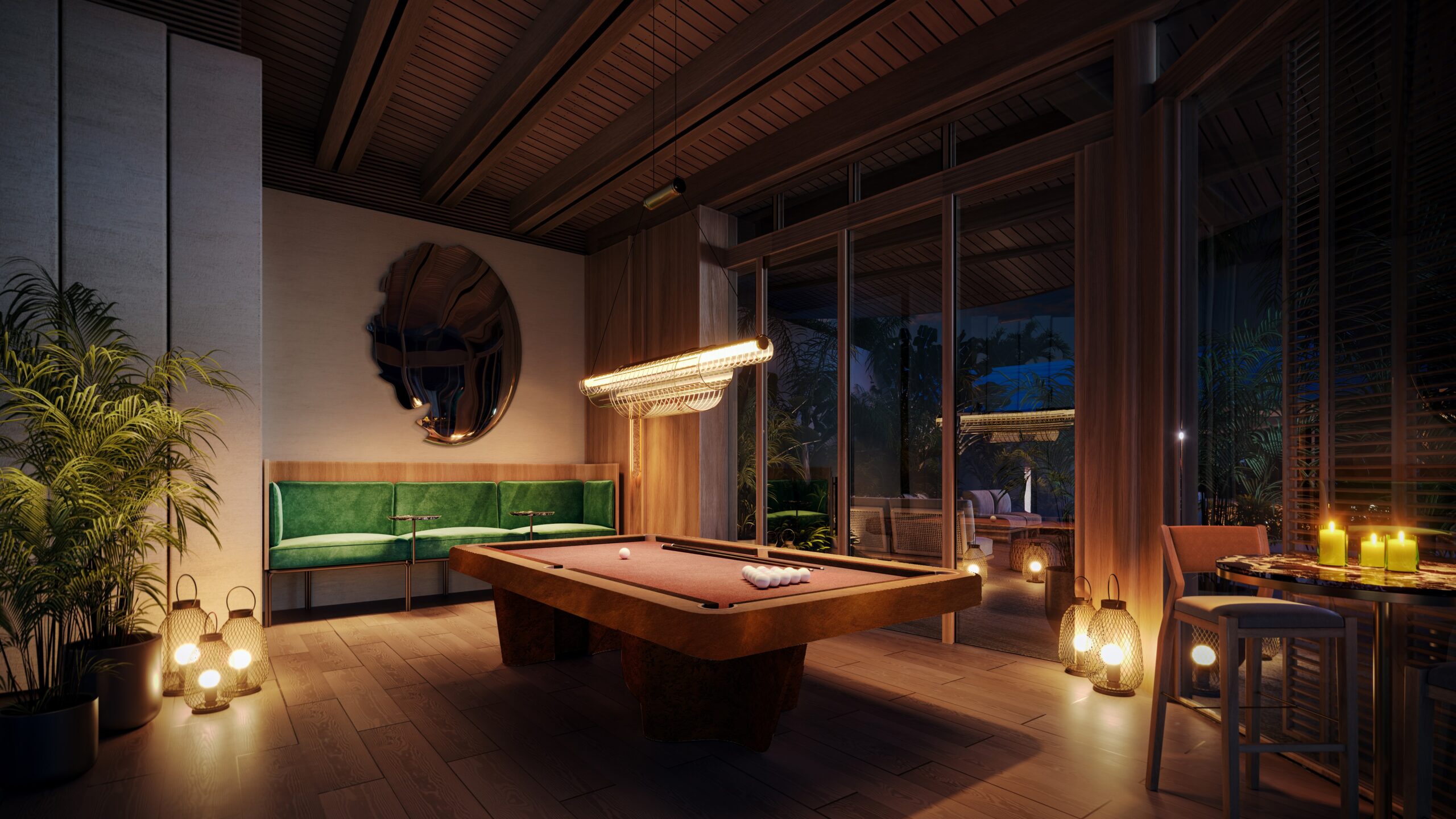 When evening arrives, The Bar at The Red Sea EDITION is the space for relaxation, conversation, and after-dinner pleasures. Rich greens, plush sofas and walnut wood tones invite guests to settle in and stay awhile. Located next to the signature restaurant, The Bar offers effortless access to more evening fun with its signature EDITION pool table, outdoor firepits and sunken seating areas.